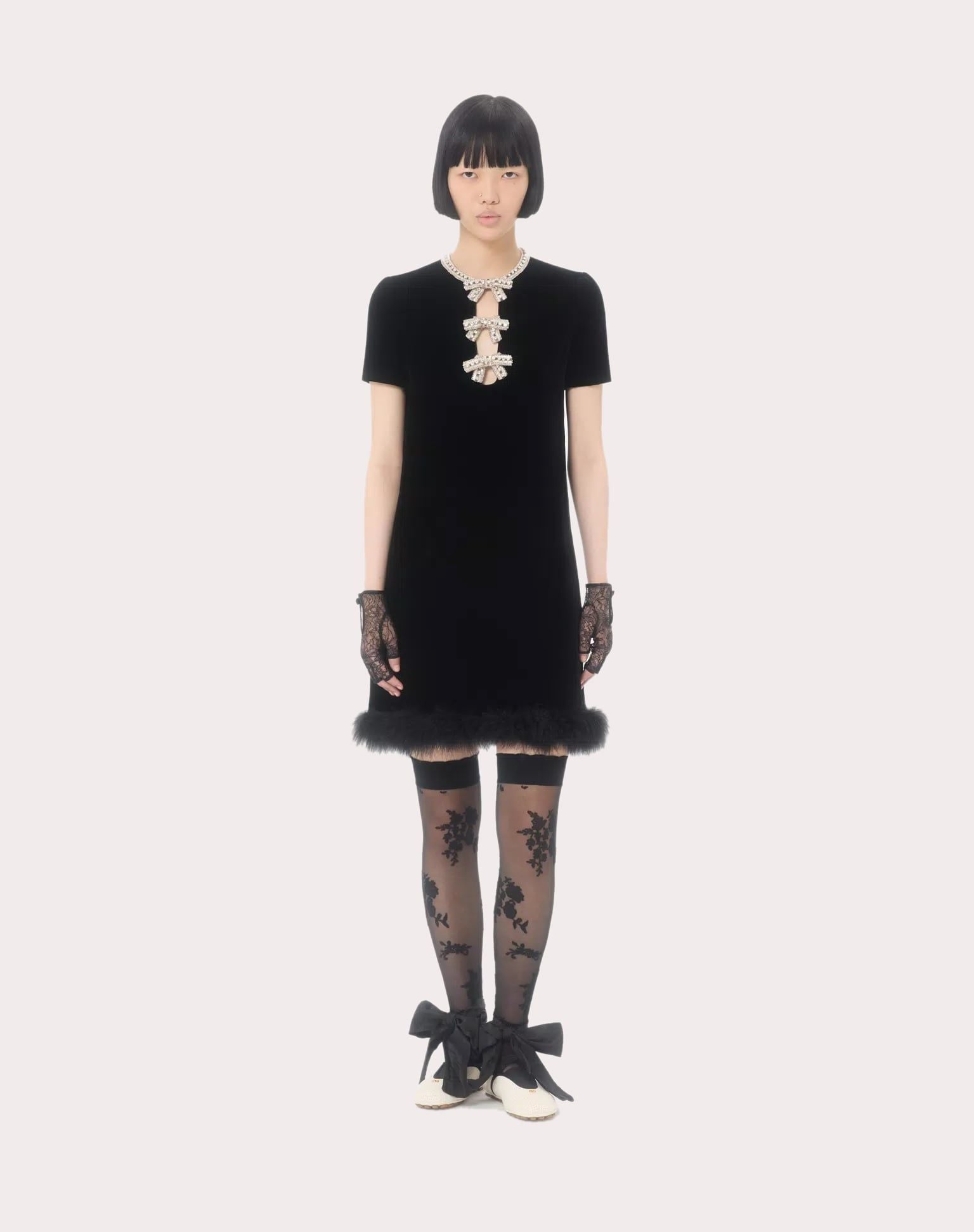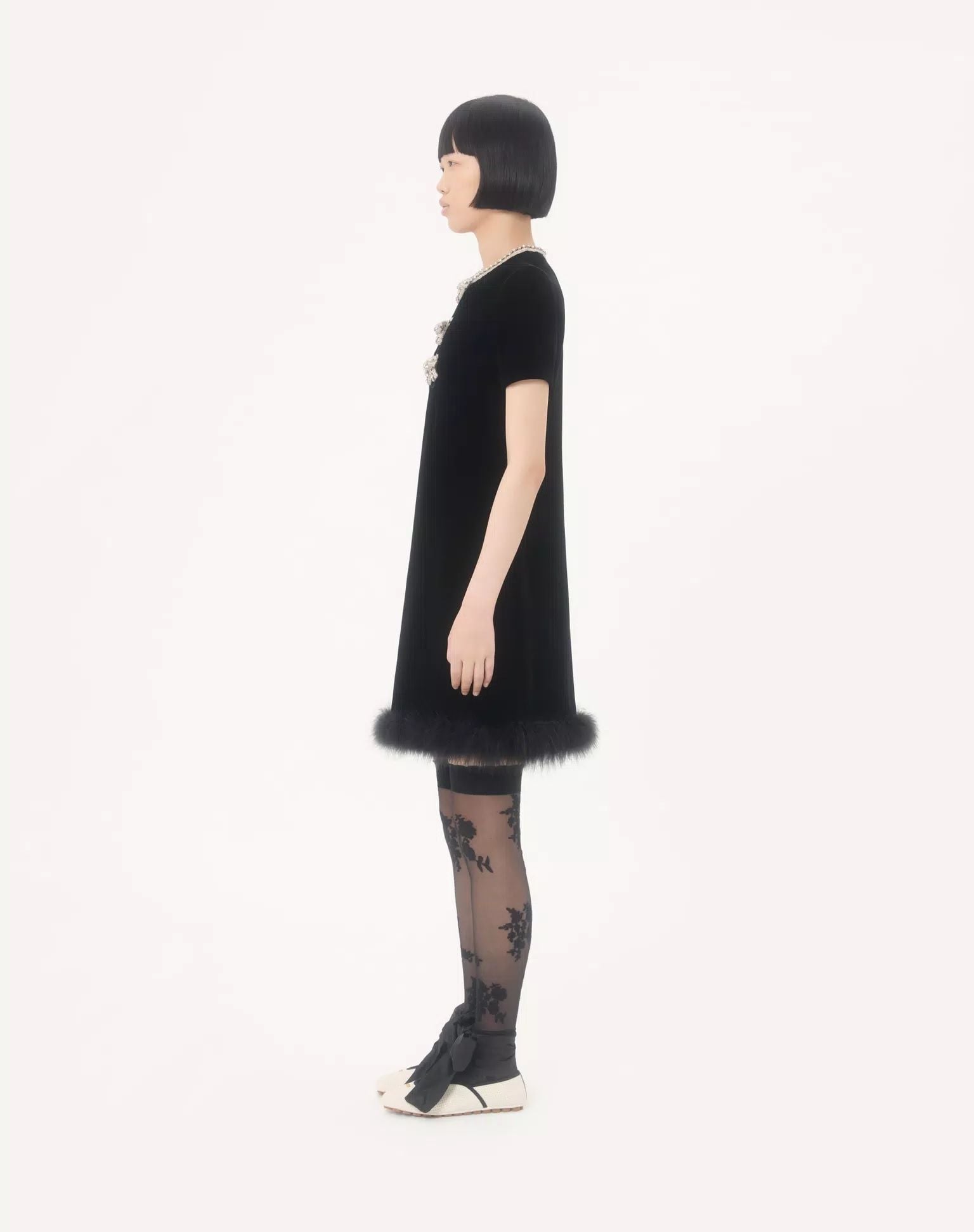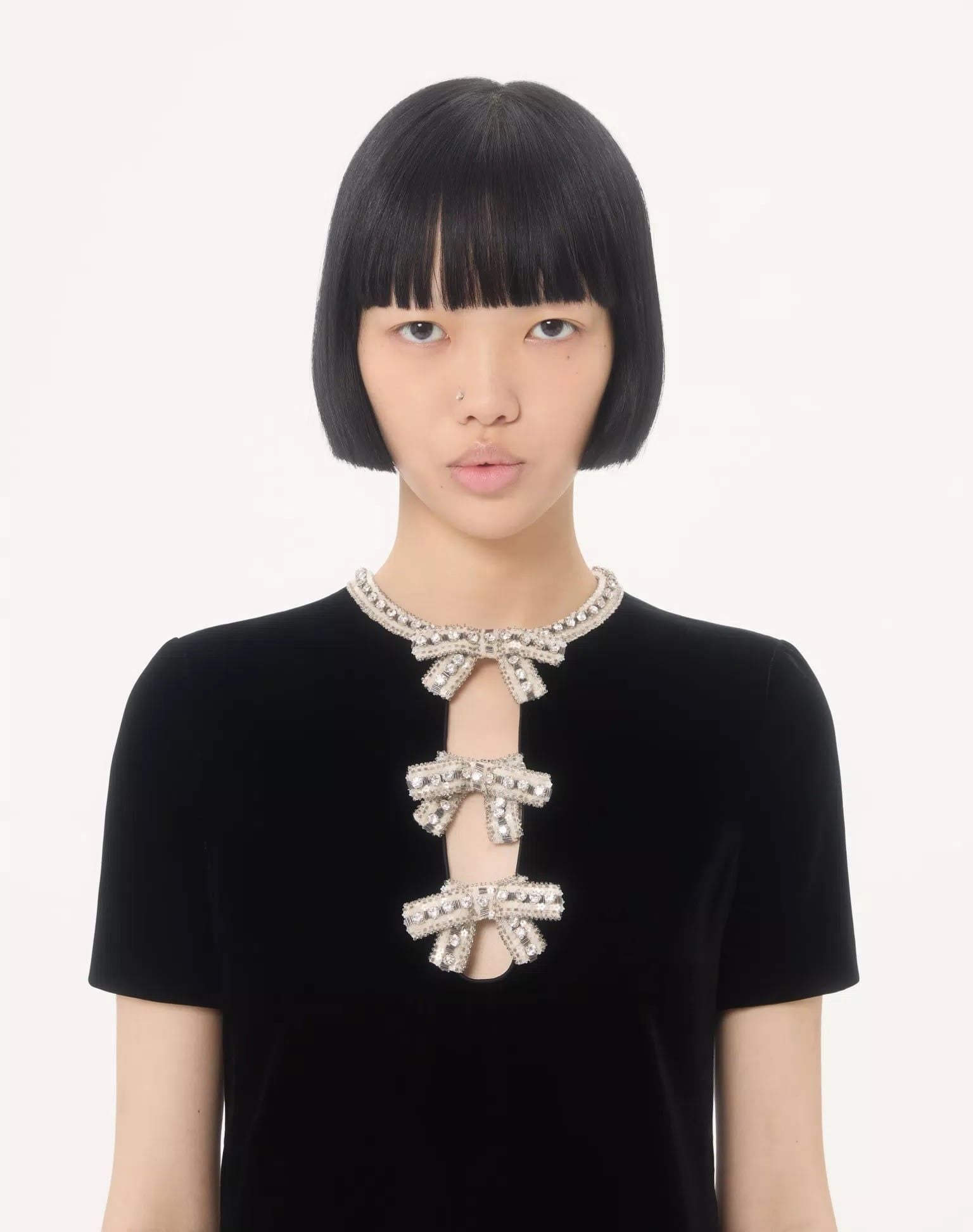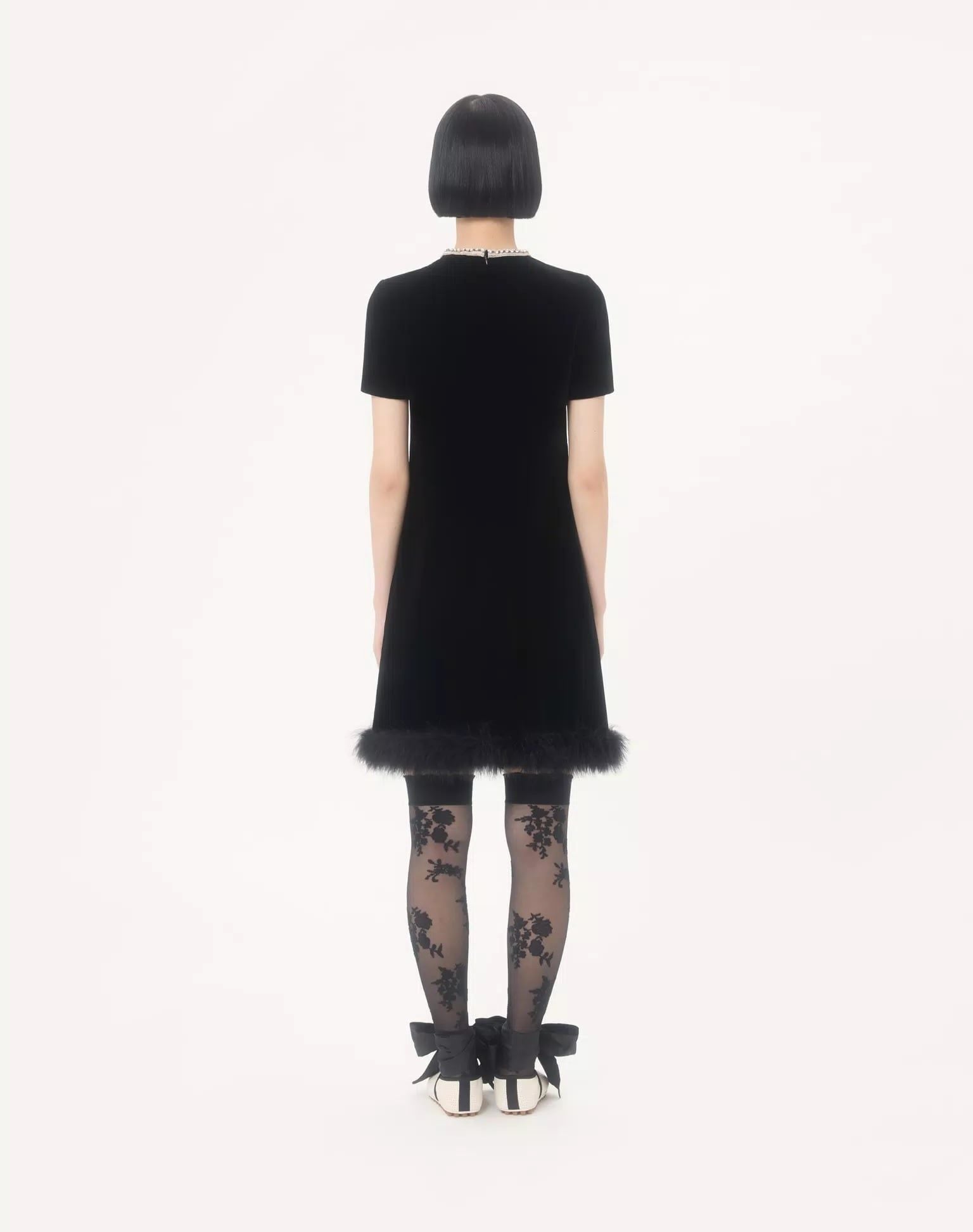Váy liênc cộc tay cổ tròn màu đen, kéo khóa sau, cổ đính đá trắng, ngực gắn 3 nơ đính đá trắng
