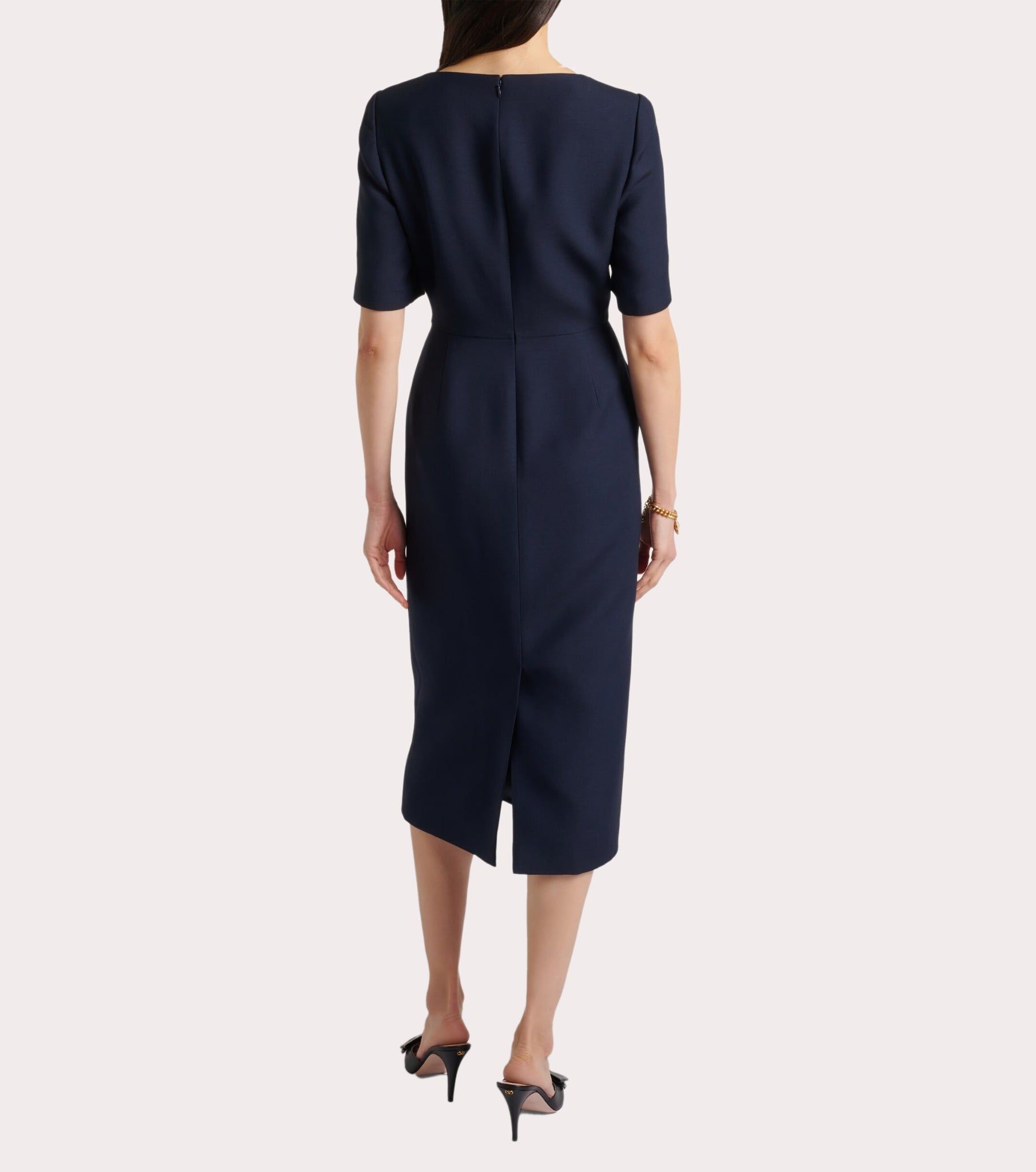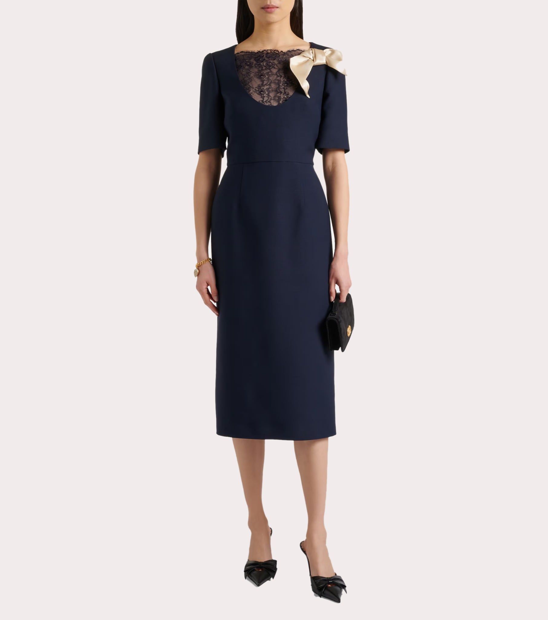 Váy liền cộc tay màu xanh tím than, kéo khóa sau, cổ sâu pha ren hoa cùng màu, cổ gắn 1 nơ màu be