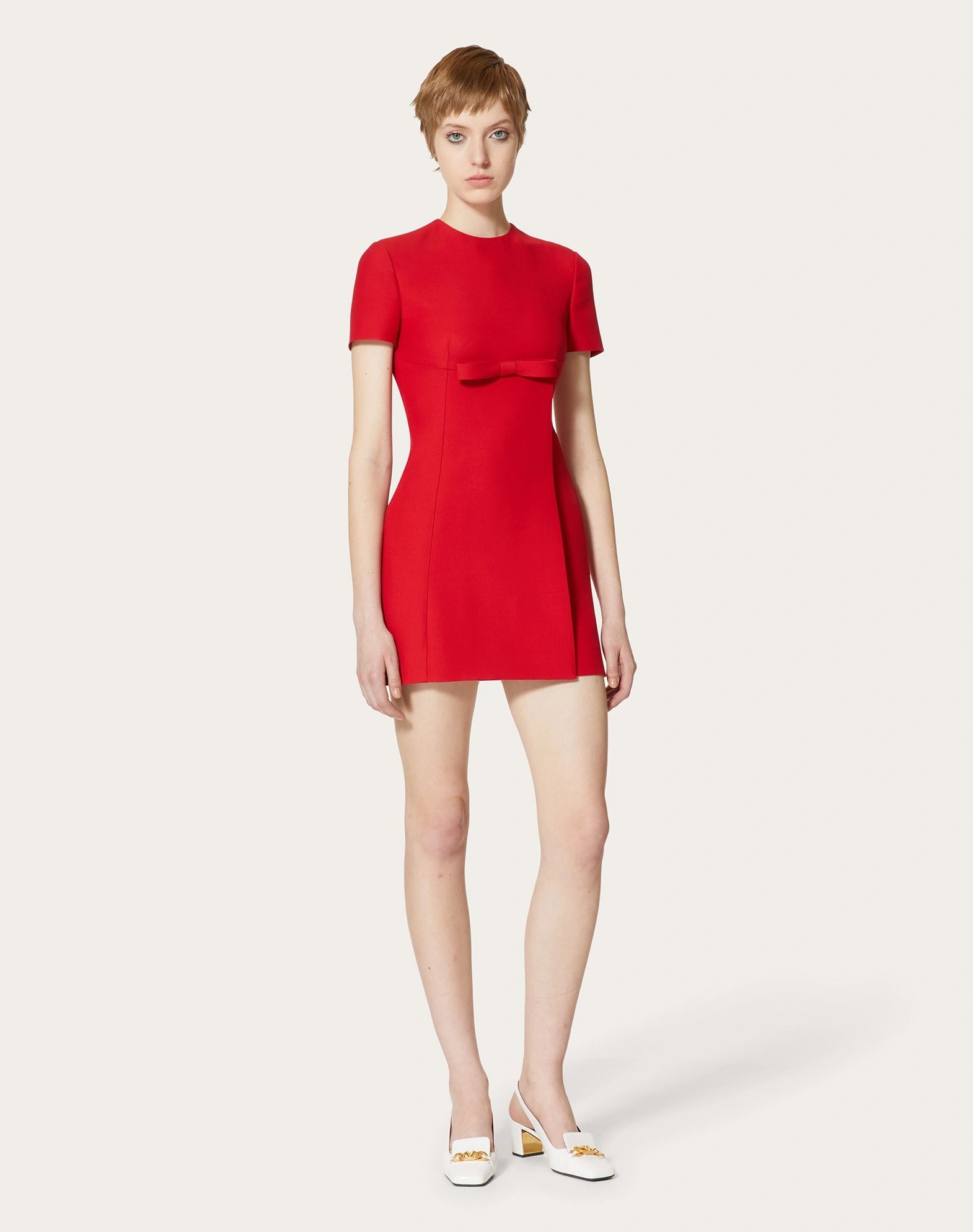 Váy liền cộc tay cổ tròn kéo khóa sau màu đỏ, trước ngực gắn 1 nơ cùng màu